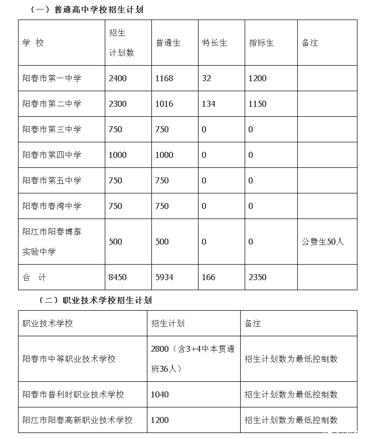 (1)特长生:由阳春市第一中学、阳春市第二中学自主招生。若实际招录特长生人数小于计划数,剩余的特长生招生计划转为普通生计划。阳春市第一中学、阳春市第二中学根据实际情况制定特长生招生方案报我局备案。